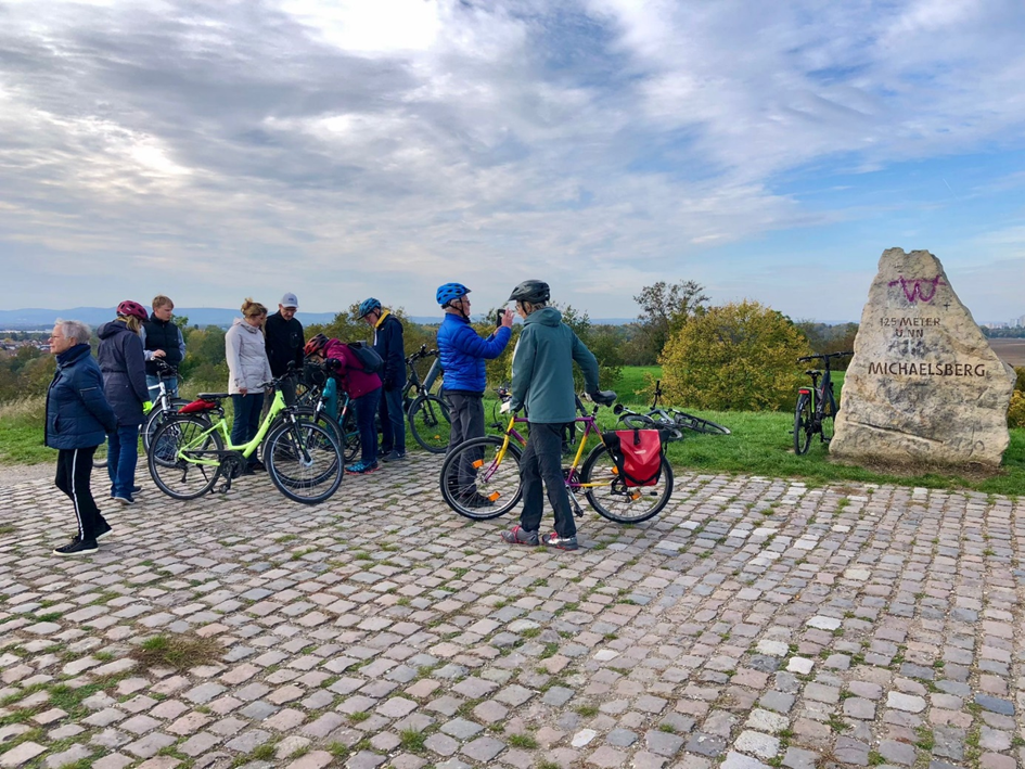 Nach dem Abschied von unserem Einzelfahrer fuhren wir los auf den Michaelsberg im Maudacher Bruch. Auf 125 Metern Höhe hatten wir eine sehr schöne Weitsicht auf Pfalz und Odenwald. Jetzt ging es langsam rückzus. An Kürbisfeldern und Großbäckerei vorbei durch den nicht ganz so grünen Teil Ludwigshafens wieder über die Brücke zurück Richtung Rheinpromenade.